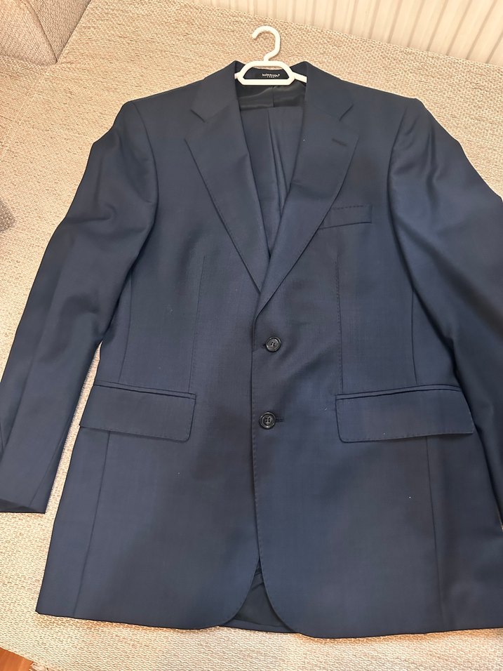 Lacivert renkte, klasik kesim ve düğmeli erkek takım elbisesi. Modern klasik tarzda, uzun kollu ve midi boyda, iş ortamları için uygundur. ️GAMBOÇU bile duruyor hiç giyilmedi.