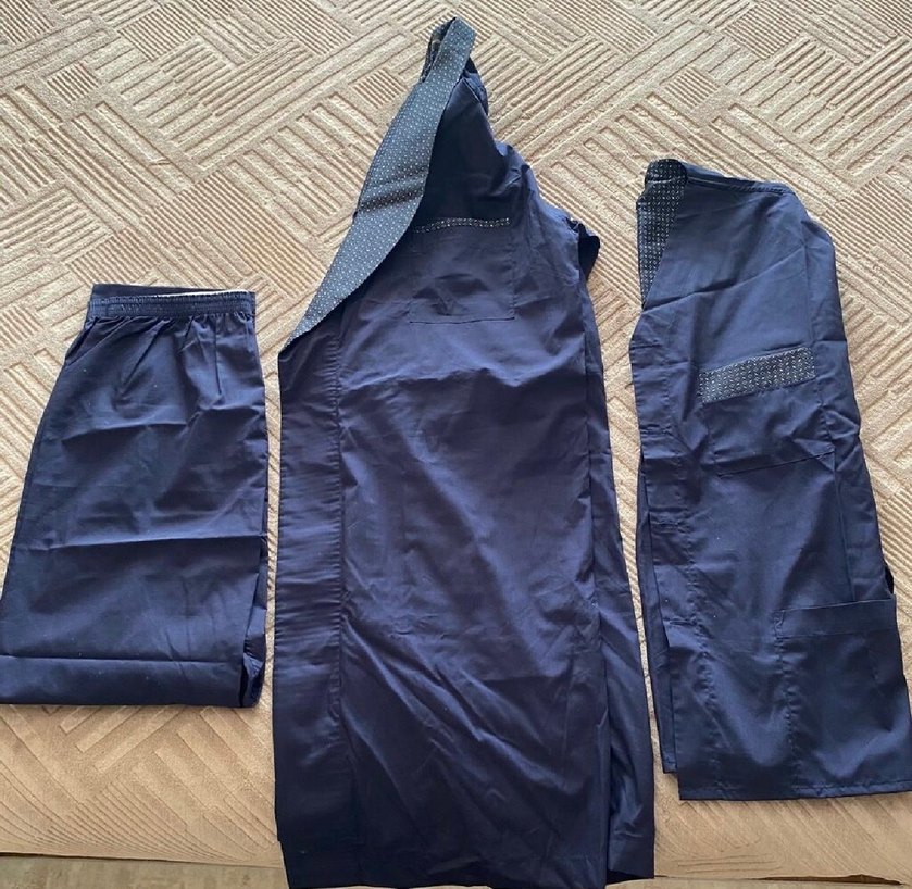 Erkekler için lacivert kolsuz, yakalı ve drapeli üst ile uzun pijama altından oluşan minimalist ve sade tarzda pijama takımı.