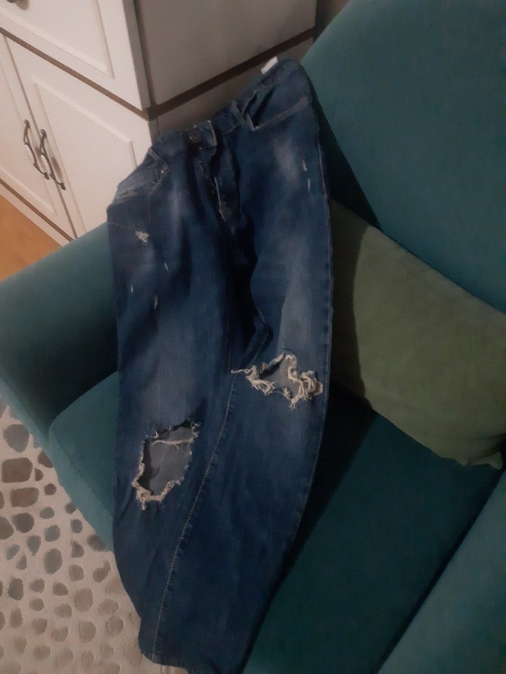 için lacivert kot pantolon, bol kesim ve normal midi boyda, tokalı detaya sahip. Yıpratılmış detaylarla günlük rahat sokak stili için uygundur.
