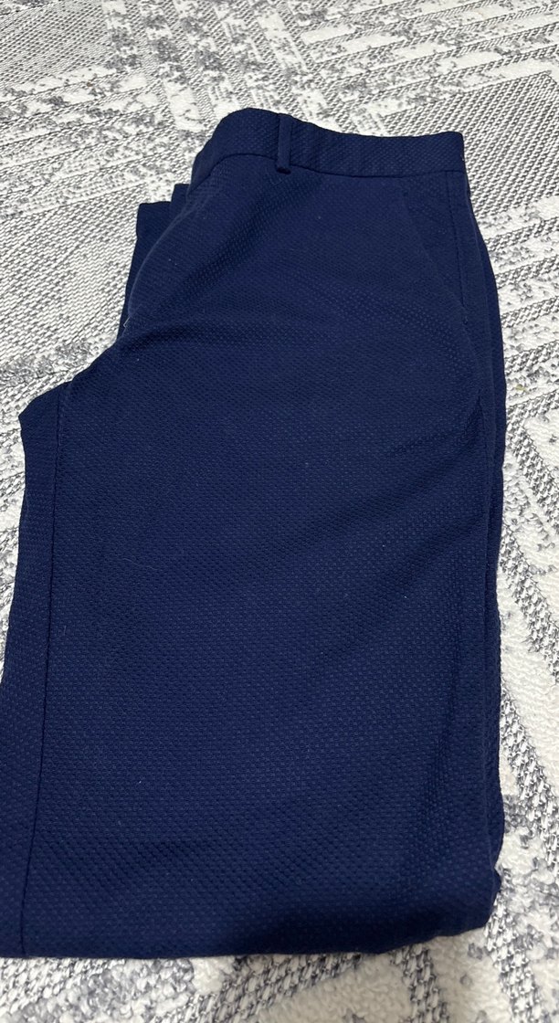 Erkekler için dar kesim, ve lacivert renkte kumaş pantolon. Düz sentetik kumaştan üretilmiş ve fermuarlı detaylara sahip, ofis kullanımı için uygundur bir defa kullanıldı