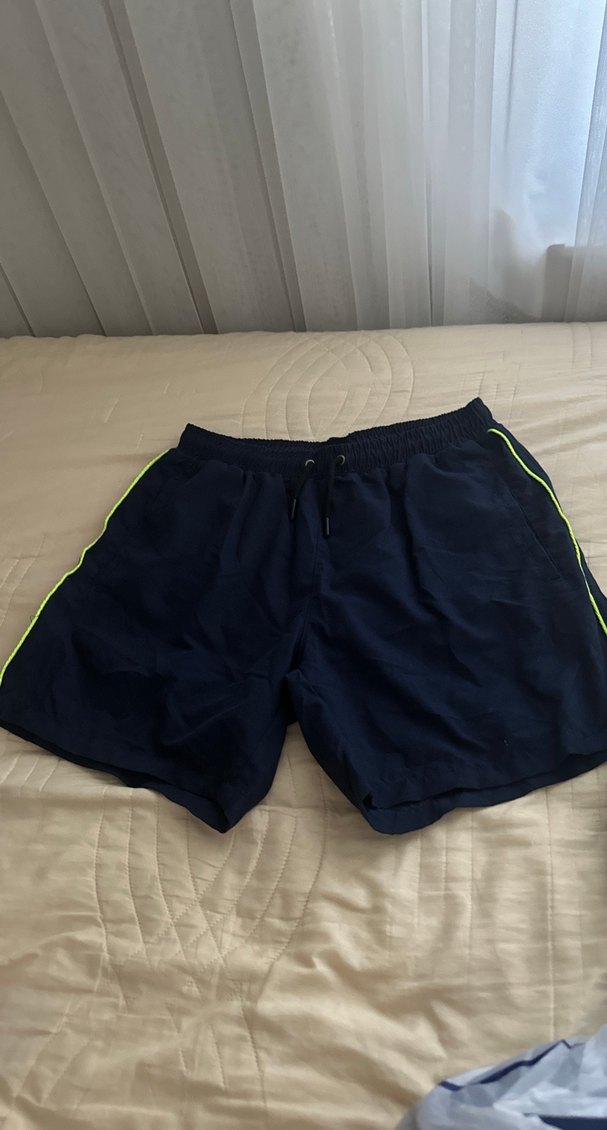 Lacivert erkek mini şort, düz tasarımlı ve yanlarda ince detaylarla plajda rahat kullanım sağlar.