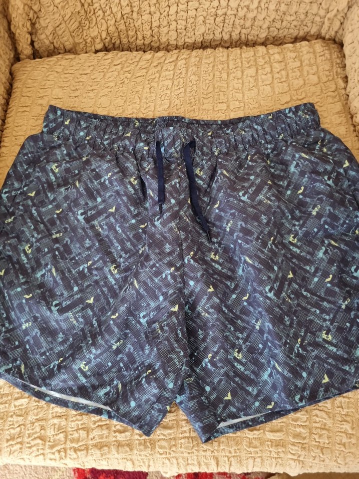 Erkekler için sentetik kumaştan, bel kemerli, bol kesim, koyu mavi mini yüzme şortu. Plaj ve sokak stiline uygun rahat tasarım.