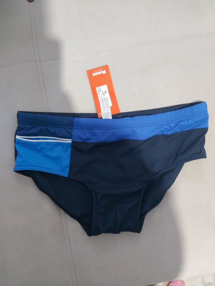 Düz, lacivert renkte, elastik bel bantlı ve dar kesimli erkek mini yüzücü mayo. Sahil için uygun, sokak giyim tarzında.