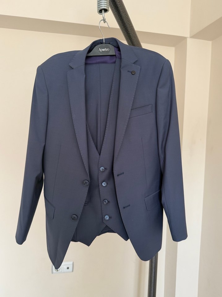 Erkek lacivert takım elbise, klasik modern tarzda, normal uzunlukta ve düğmeli. Ofis kullanımı için uygun, uzun kollu ve regular fit.