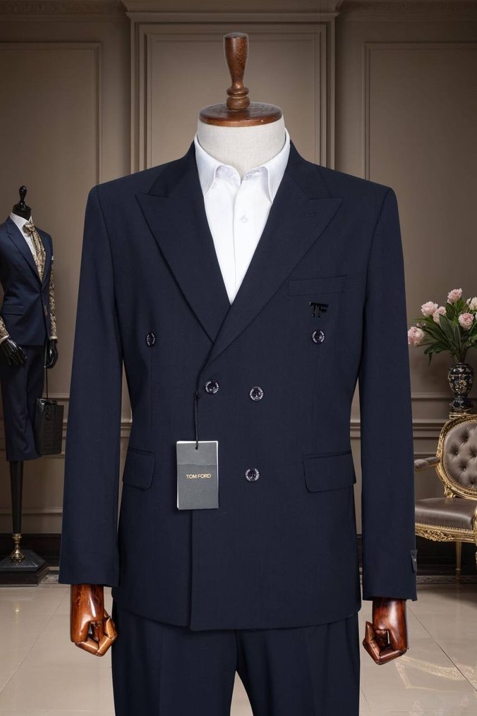 Lacivert renkte, düğmeli ön kısmı ve uzun kollu, klasik modern tarzda erkek takım elbisesi. Regular fit ve uzun boy kesimi ile iş ortamına uygundur.