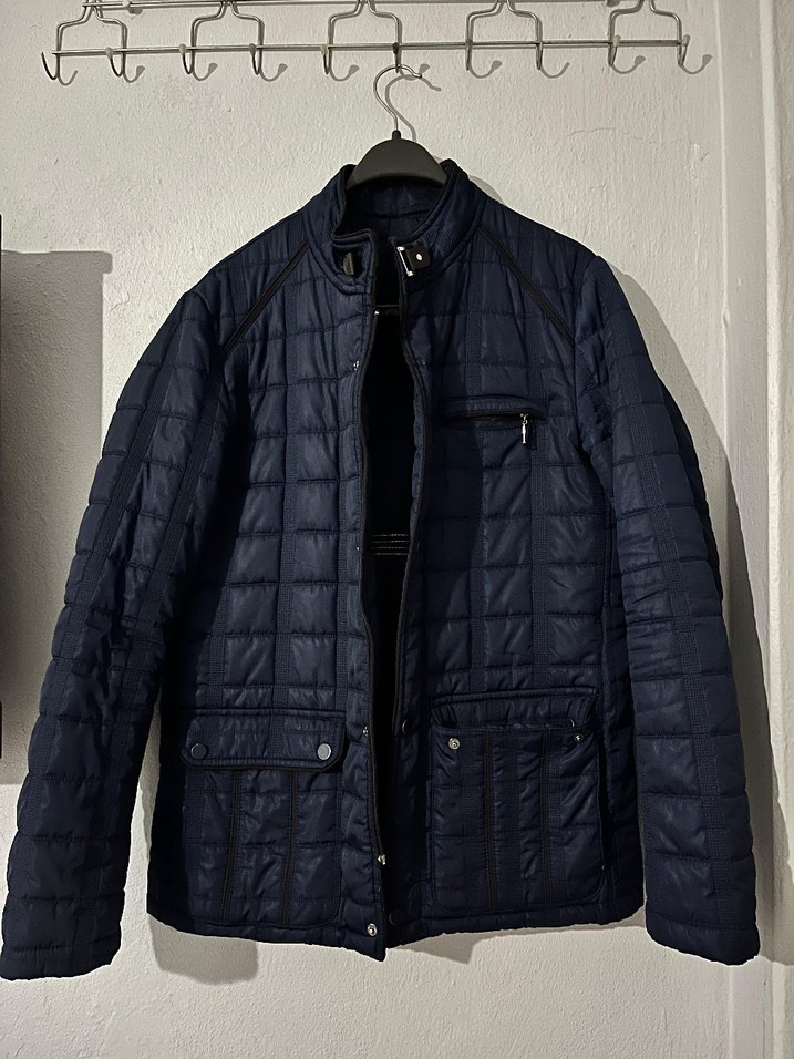 Lacivert renkte, notched lapel yakalı, uzun kollu erkek kapitone ceket. Bel detaylı, fermuarlı göğüs ve düğmeli alt ceplerle günlük sokak stili için uygun.