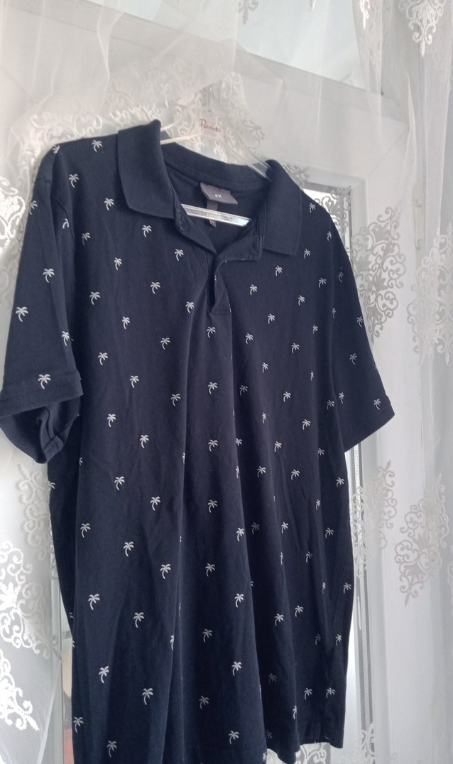 Lacivert renkli erkek polo tişört, kısa kollu ve yakalıdır. Baskılı deseni ve rahat, günlük stil için uygundur..H M...marka... ️xl beden