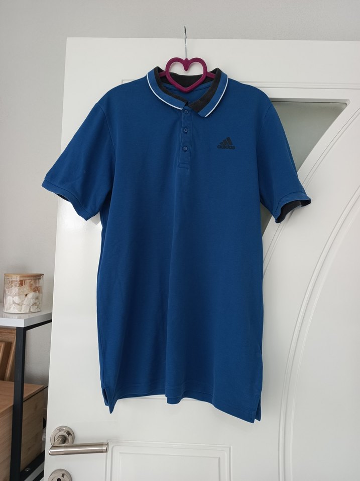 Düğmeli yakalı ve kısa kollu, rahat kesim erkek tişörtü. Koyu mavi sentetik kumaştan, günlük kullanıma uygun.
