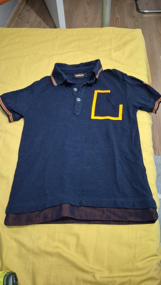 Erkek çocuklar için lacivert renkli, düğmeli polo yaka tişört. Kısa kollu, bol kesim ve sarı renkte baskılı cep detayı bulunur. Sentetik kumaştan üretilmiştir. 4 yaş