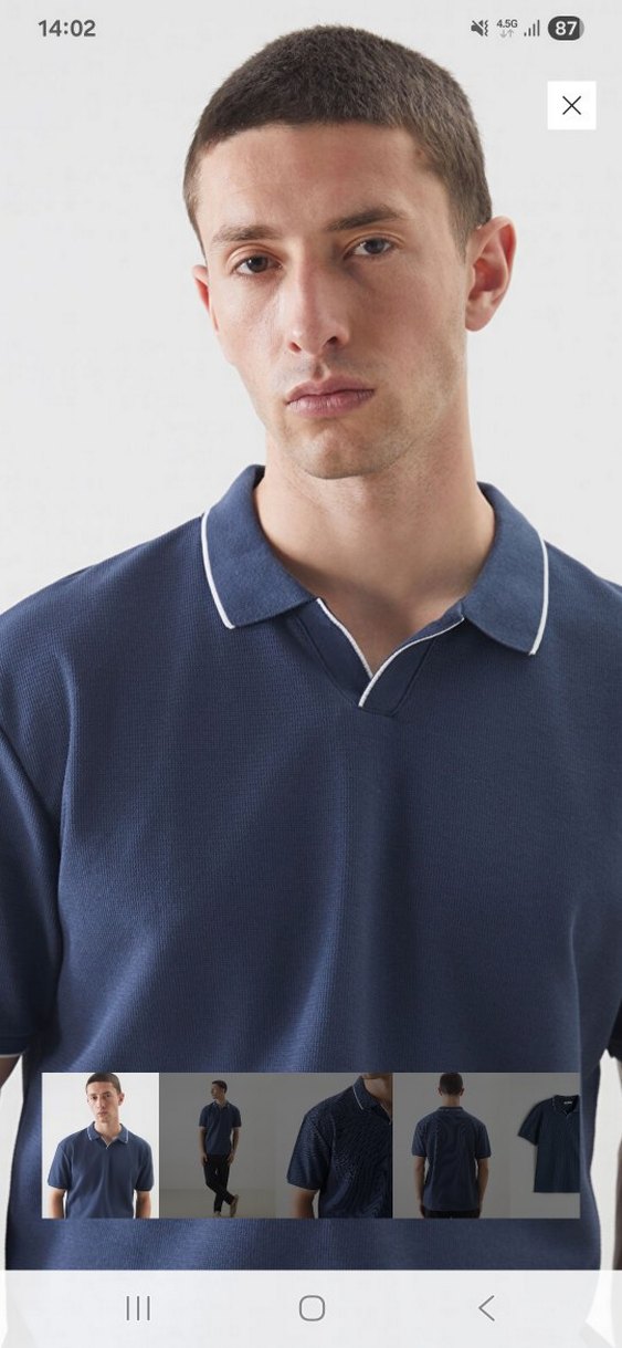 Erkekler için lacivert renkli, gri detaylı, kısa kollu polo yaka tişört. Rahat kesimi ve yumuşak sentetik kumaşıyla günlük kullanım için uygundur.