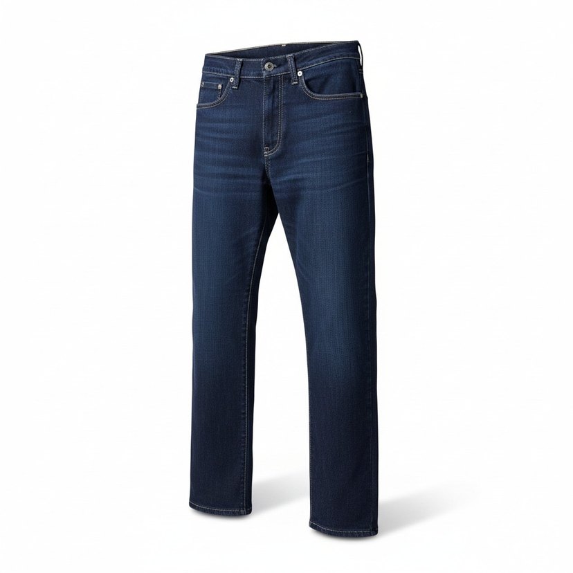 Lacivert renkte, kemerli ve parlak görünümlü, normal boy regular fit denim pantolon. Günlük rahat kullanım için uygundur.
