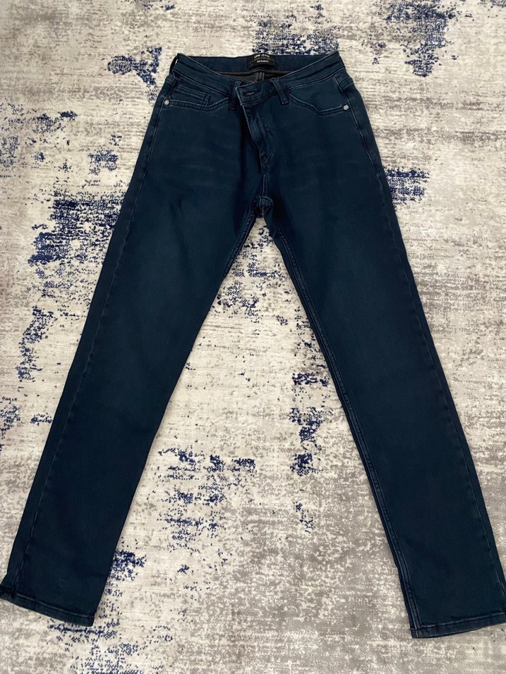 Lacivert kot pantolon, regular fit ve normal boyda, belde tokalı detaylı. Sokak tarzı için uygun, günlük kullanıma ideal.