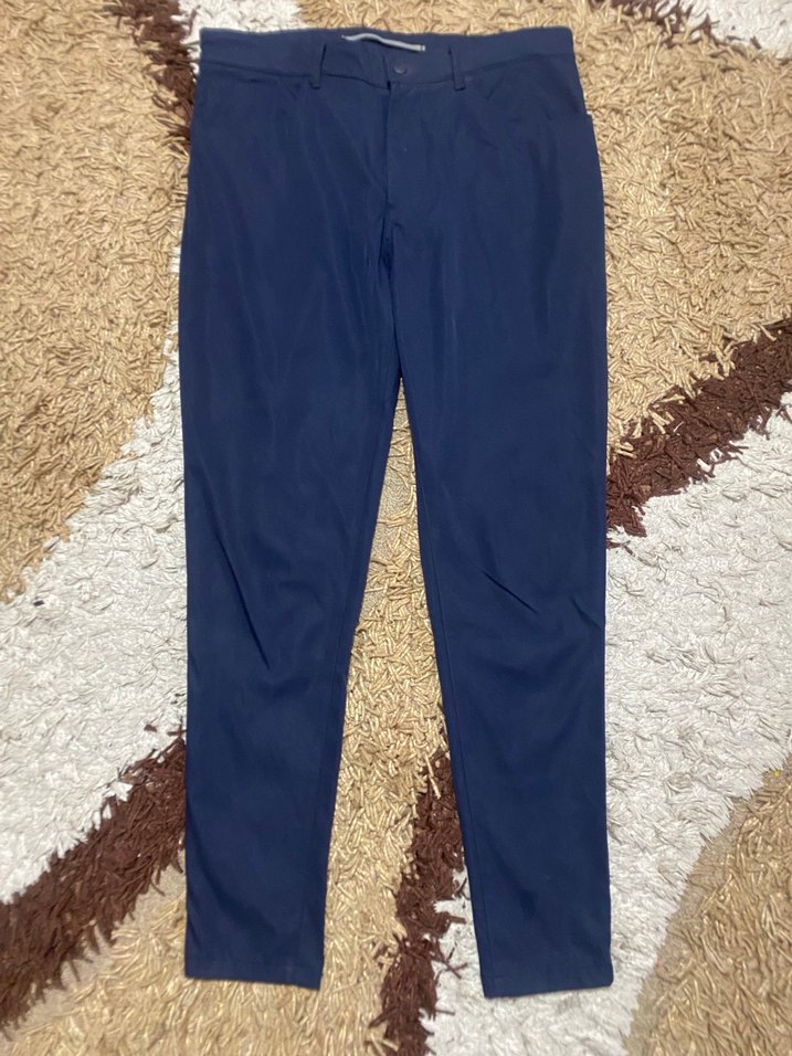 Erkekler için regular fit ve normal boyda, koyu lacivert renkte pantolon. Düz, sentetik kumaştan üretilmiş, ofis için uygun, zahmetsiz şıklık sunan sokak stili pantolon.