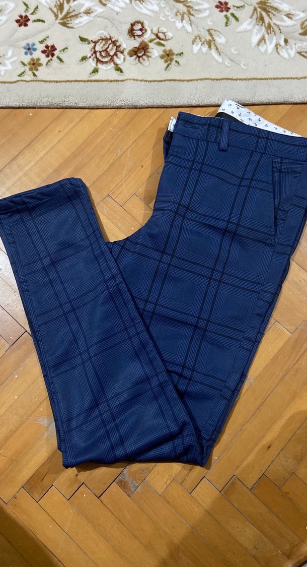 Erkekler için regular fit, koyu lacivert renkte, ince kare desenli, sentetik kumaştan yapılmış, tokalı ve normal boyda pantolon.