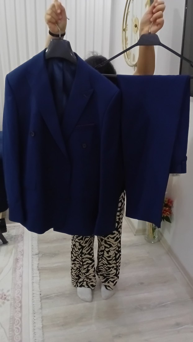 Erkekler için koyu lacivert, kesik yakalı, uzun kollu ve düğmeli regular fit takım elbise. Ofis ve sokak stiline uygun.