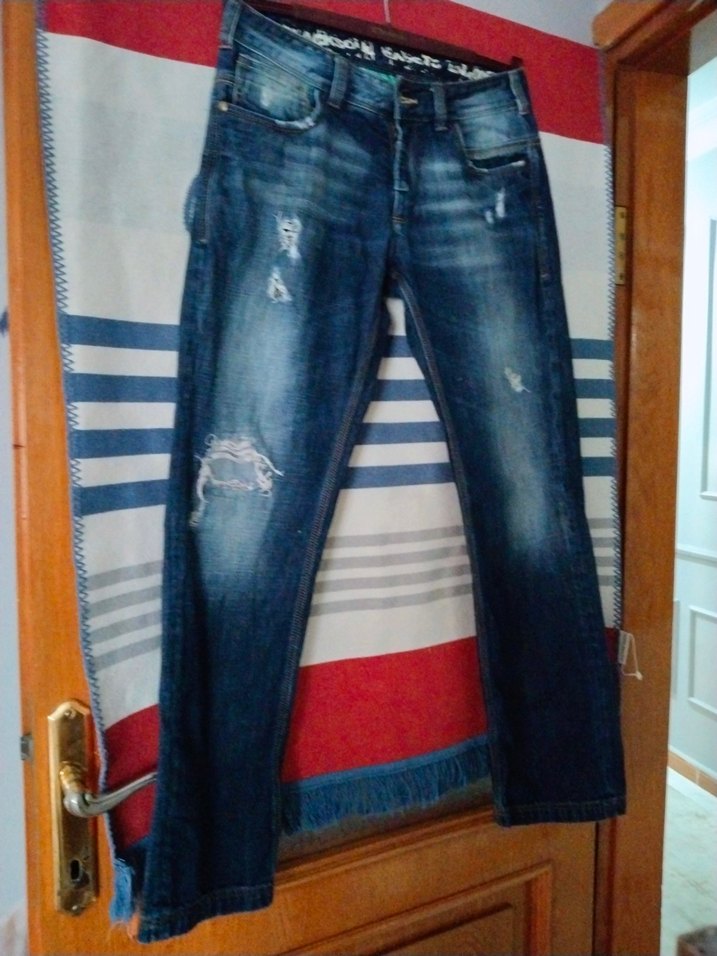 Erkekler için koyu mavi renkte, bol kesim ve tokalı detaylı kot pantolon. Midi boyda, gündelik rahat kullanıma uygun sokak stili, hafif yıpranmış görünümlü.