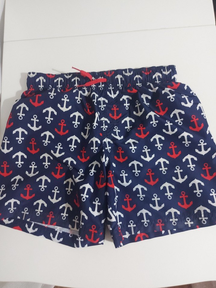 Lacivert renkli, renkli çapa desenli, düğmeli ve bağcıklı bel detaylı, bol kesim erkek mini şort. Sahil için uygun, sokak stiliyle uyumlu.