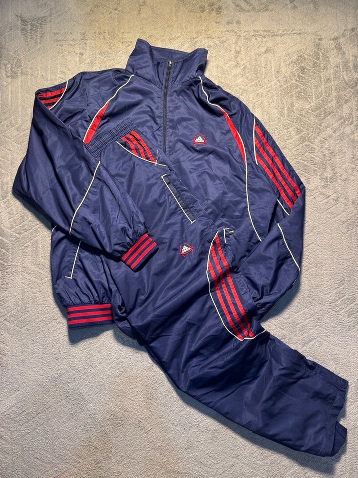 Erkekler için lacivert, sentetik kumaştan yapılmış, fermuarlı, uzun kollu, normal midi boyda spor rüzgarlık mont. Kırmızı şerit detaylarıyla athleisure ve streetwear tarzına uygundur.