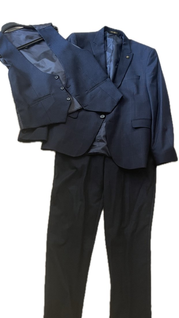 Erkekler için lacivert renkli, regular fit kesime sahip takım elbise. Düğmeli ceket, uzun kollu ve klasik şıklıkta, ofis kullanımı için uygun.