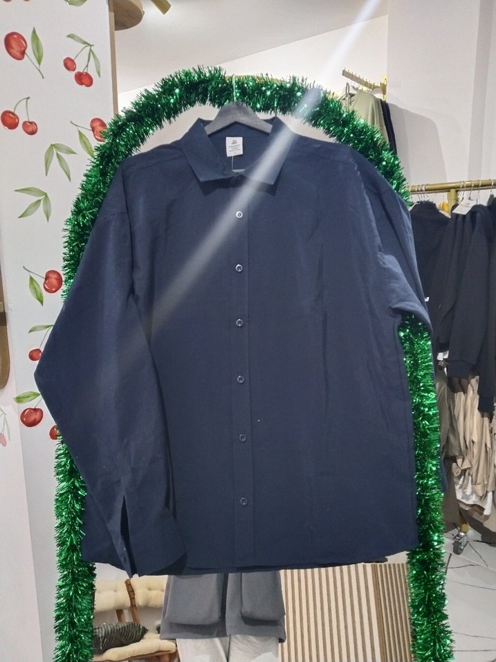 Erkekler için uzun kollu, yakalı ve düğmeli önlü gömlek. Normal boy ve regular kesim, sentetik lacivert kumaştan, ofis ve iş ortamına uygun.