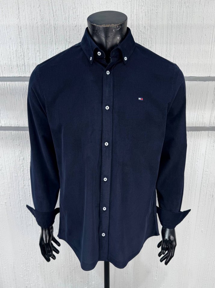 Erkekler için koyu mavi renkte, düğmeli ve çıtçıtlı yakalı gömlek. Sentetik kumaştan üretilmiş, regular fit ve uzun kolludur, ofis ve günlük sokak stili için uygundur.