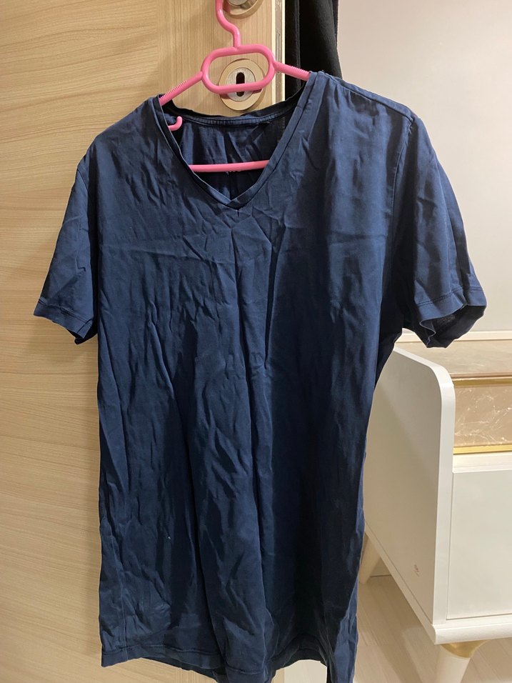 Erkekler için normal boyda, bol kesim ve lacivert renkte V yaka, desen içermeyen rahat tişört.