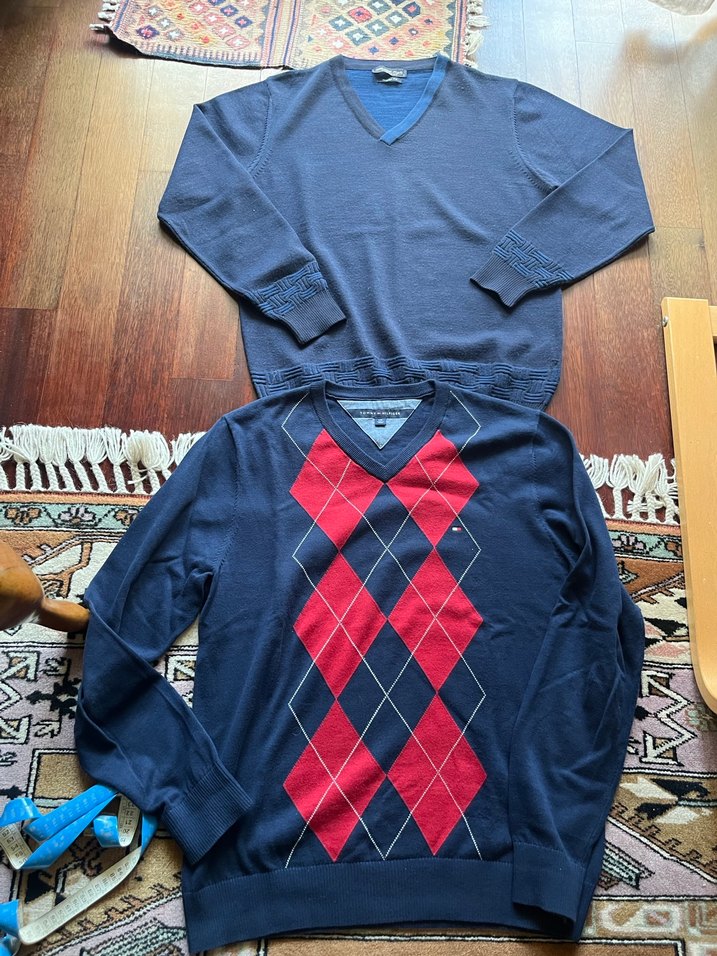 Orjinal TH ve Abdullah Kigili triko-hatasiz-FIYATLAR IKISI ICIN TOPLAMDIR-Tommy L BEDEN-Abdullah Kigili M Beden-TOMMY lacivert yzeirne baklava motif kirmizi ve beyaz-AK ise lacivert ve desenli-ikiside iyi durumdadir-sinirli kullanildilar Uzun kollu, V yakalı, lacivert renkli pamuklu triko kazak. Normal boy ve oturan kesimle günlük kullanıma uygun.