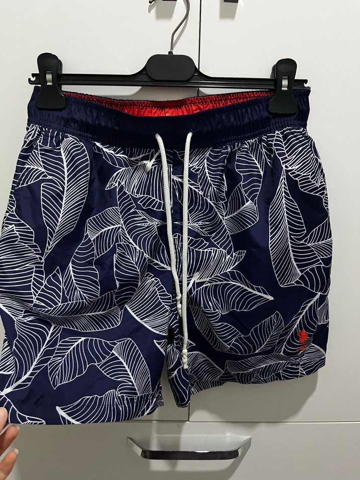 Lacivert erkek mini şort, yaprak desenli ve bol kesim. Elastik bel ve ayarlanabilir bağcık detaylarıyla plaj ve günlük sokak stili için uygundur.