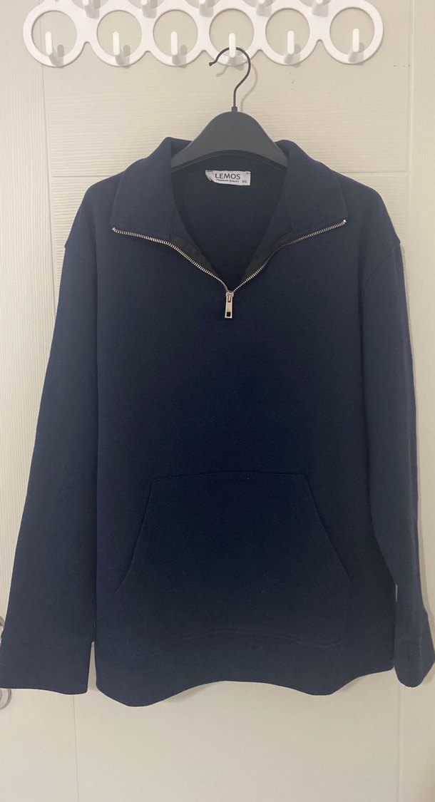 Yarım fermuarlı, yüksek yakalı, uzun kollu, bol kesim ve yumuşak fleece kumaştan yapılmış lacivert erkek sweatshirt. Günlük rahat kullanıma uygundur.