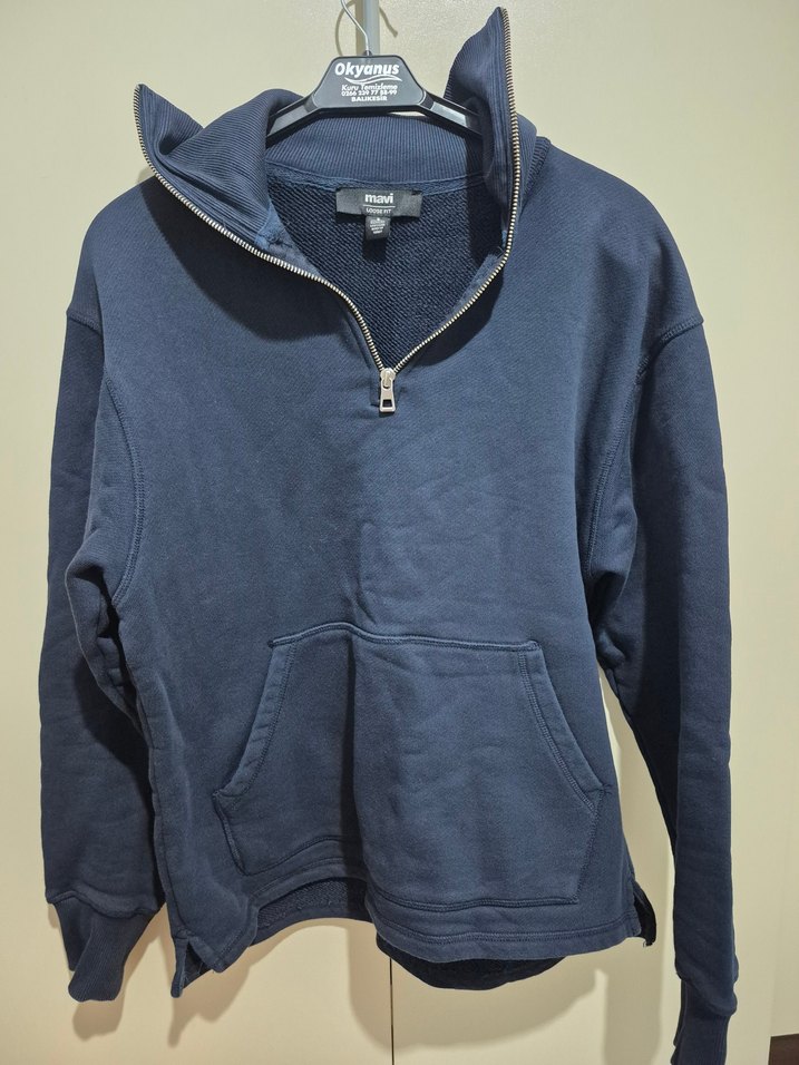 Erkek sweatshirt, yüksek yakalı fermuarlı ve uzun kolludur. Yumuşak kumaştan olup bol kesim ve cep detayıyla günlük rahatlık sunar. Düz lacivert renktedir. s beden mavi marka