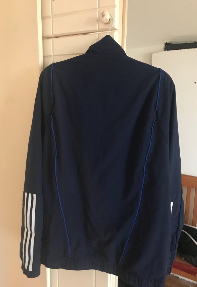 Lacivert renkli, yüksek yakalı ve fermuarlı erkek ceketi. Sentetik yumuşak kumaştan, kol kısmında çizgili detaylarla sokak stiline uygun.