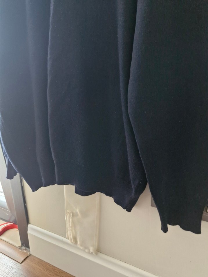 Erkek lacivert kesim midi kazak. Uzun kollu, yuvarlak yaka ve dökümlü tasarıma sahip. Ofis için minimal ve normcore tarzda, sentetik kumaştan üretilmiştir.