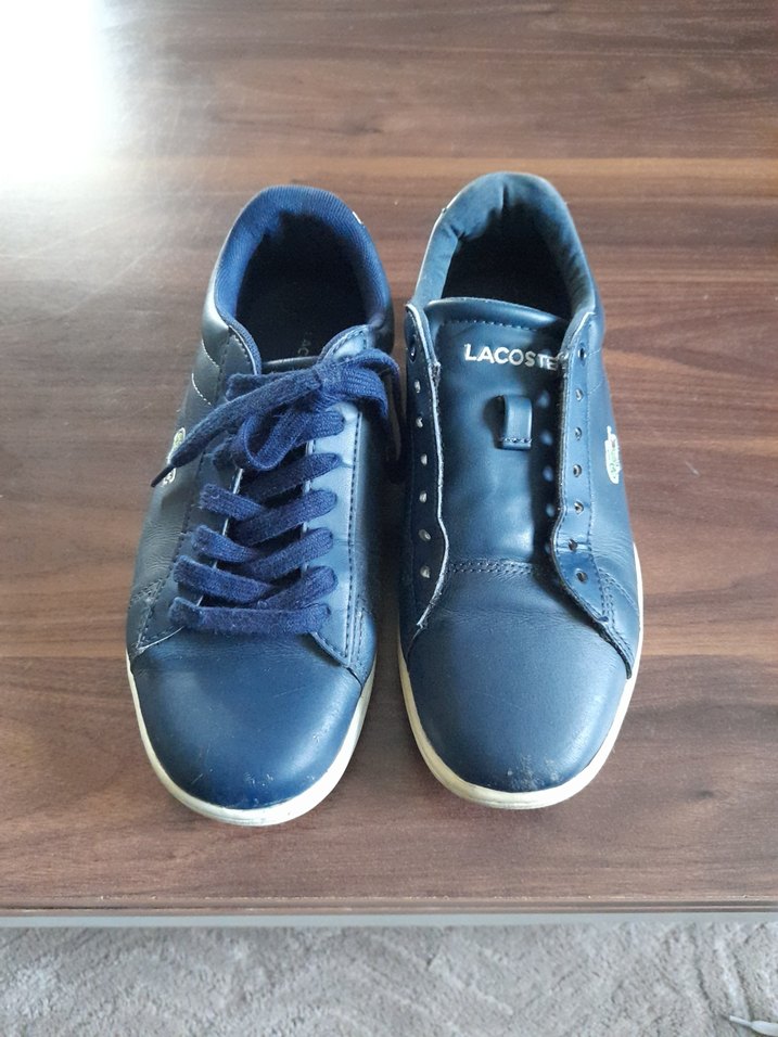 Lacoste marka, lacivert renkte, beyaz tabanlı, minimalist sokak stili erkek spor ayakkabısı. Rahat ve çok yönlü kullanım sunar. 36 numaradır .tek bağcığı yoktur.orijinaldir.önünde boya halledilebilecek minik soyulma vardır.
