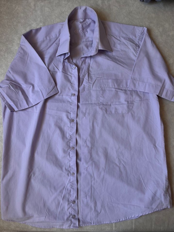 Erkek Lila renkli keten gömlek, kısa kollu ve yakalıdır. Düğmeli ön kısmı ve bol kesimiyle rahat bir kullanım sunar.