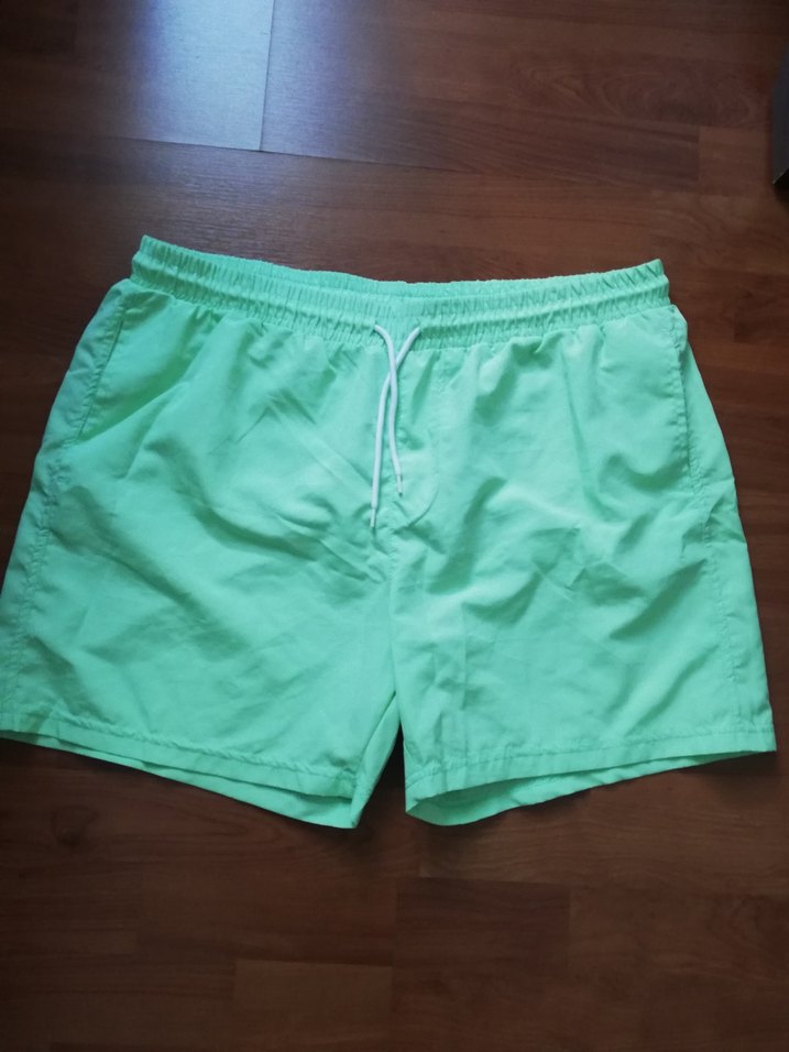 Pastel yeşil, loose fit, mini boy erkek deniz şortu. Basic tasarımlı, elastik bel ve bağcık detaylı, plaj ve sokak stiline uygun.