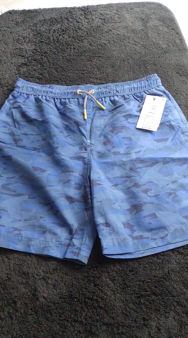 Mavi renkli, bağcıklı bel ve tie-dye desenli, bol kesim erkek yüzme şortu.