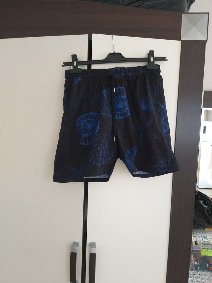 Erkekler için elastik bel bantlı, rahat kesim, koyu mavi bağlamalı desenli mini şort. Plajda ve sokak modasında kullanıma uygun.