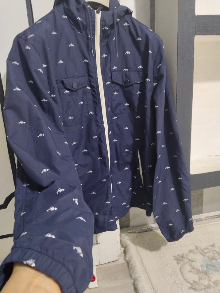 Erkekler için bol kesim, çıtçıtlı yakalı ve uzun kollu yağmurluk. Parlak mavi baskılı sentetik kumaştan, önünde fermuar vardır. Sokak stili için uygundur. ☔
