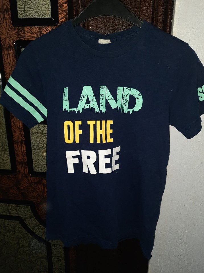 Erkekler için koyu mavi renkli, bol kesim denim tişört. Kısa kollu, bisiklet yaka ve üzerinde 'LAND OF THE FREE' renkli baskı ile sokak tarzı.