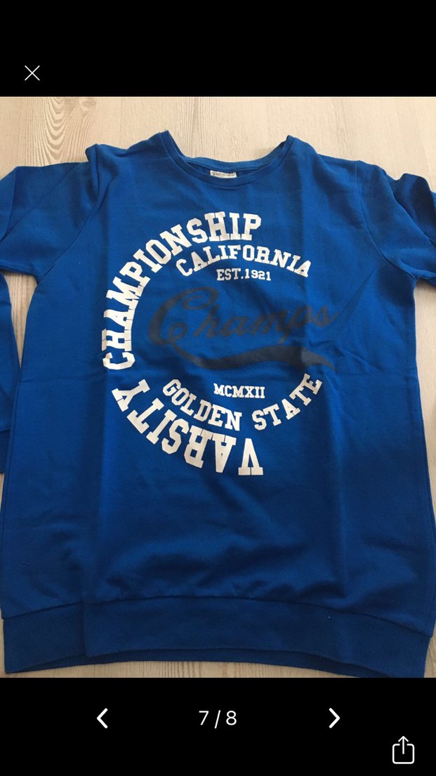 Erkekler için uzun kollu, yuvarlak yaka, bol kesim pamuklu sweatshirt. Parlak mavi renkte, üzerinde "MCMXII" ve "EST.1921" yazılı baskı bulunur. Sayılı kullanılmış tertemiz sorunsuz ürün.Küçük geldiği için satıyorum