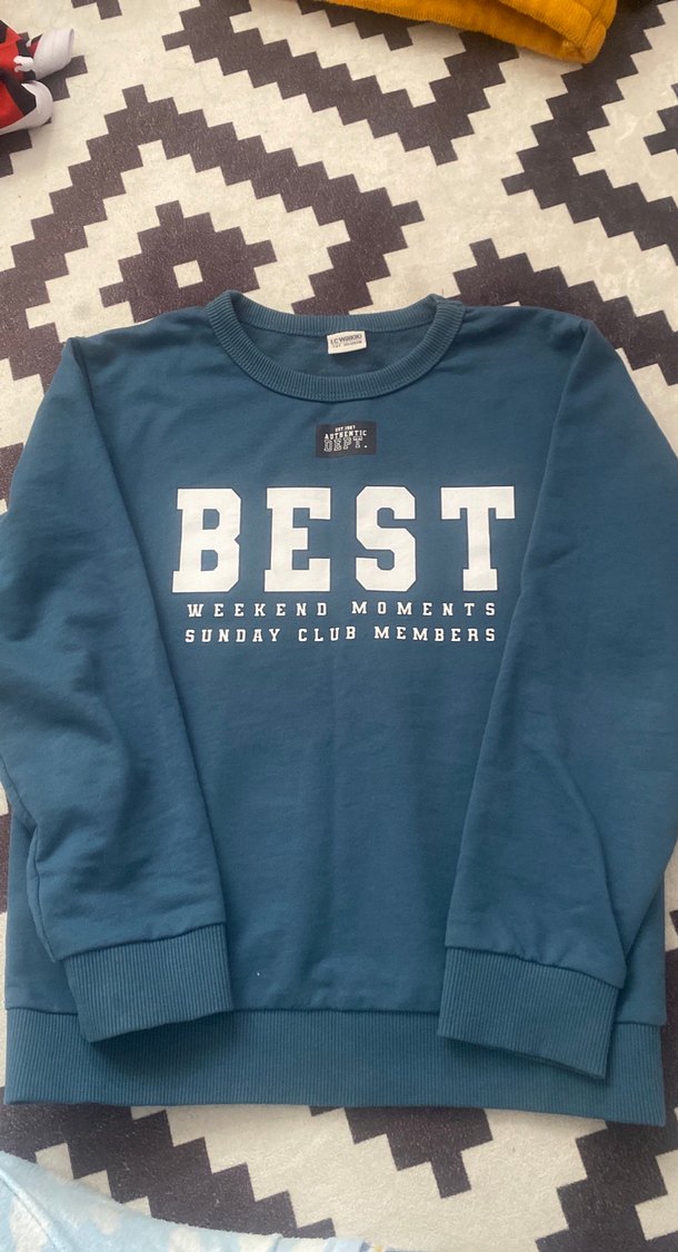 Erkek sweatshirt uzun kollu, yuvarlak yaka ve bol kesimdir. Koyu mavi renkte, önünde "BEST, WEEKEND MOMENTS, SUNDAY CLUB MEMBERS" baskısı vardır. Yumuşak ve sıcak kumaştan, rahat sokak stiline uygundur.