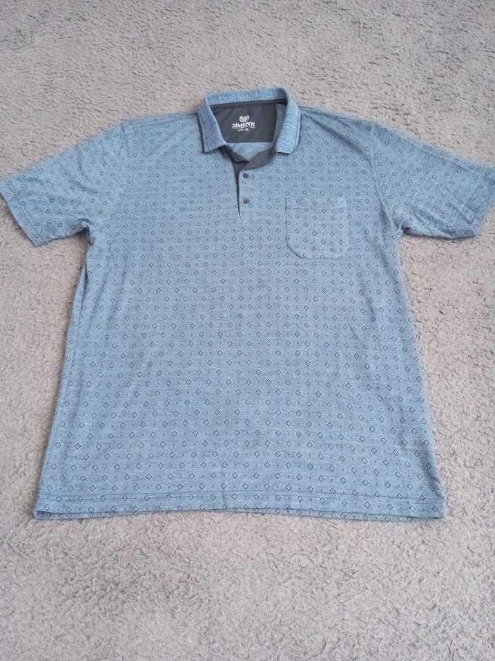 mavi batik desenli, düğmeli yakalı, kısa kollu, bol kesim erkek denim polo tişört. Günlük rahat kullanım için uygundur.