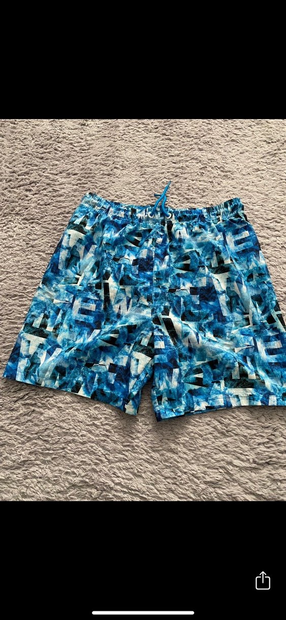 Erkekler için bol kesim, canlı mavi batik desenli, kemerli mini şort, plaj ve sokak giyimi için uygundur. 11 yaş