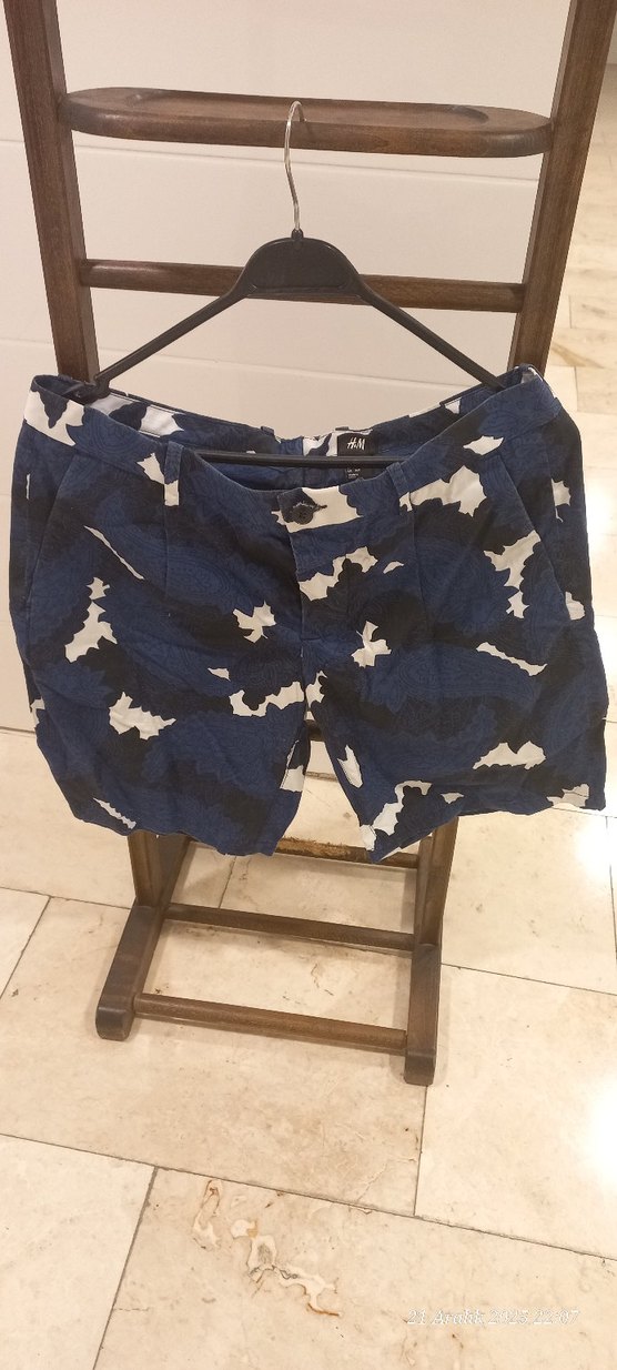 Koyu mavi batik desenli, kemer detaylı, bol kesim erkek şort. Denim kumaştan üretilmiş, rahat ve dış mekan kullanımı için uygun. Beden 50, listede olmadığı için xxl seçilmiştir.yıkanması lazım