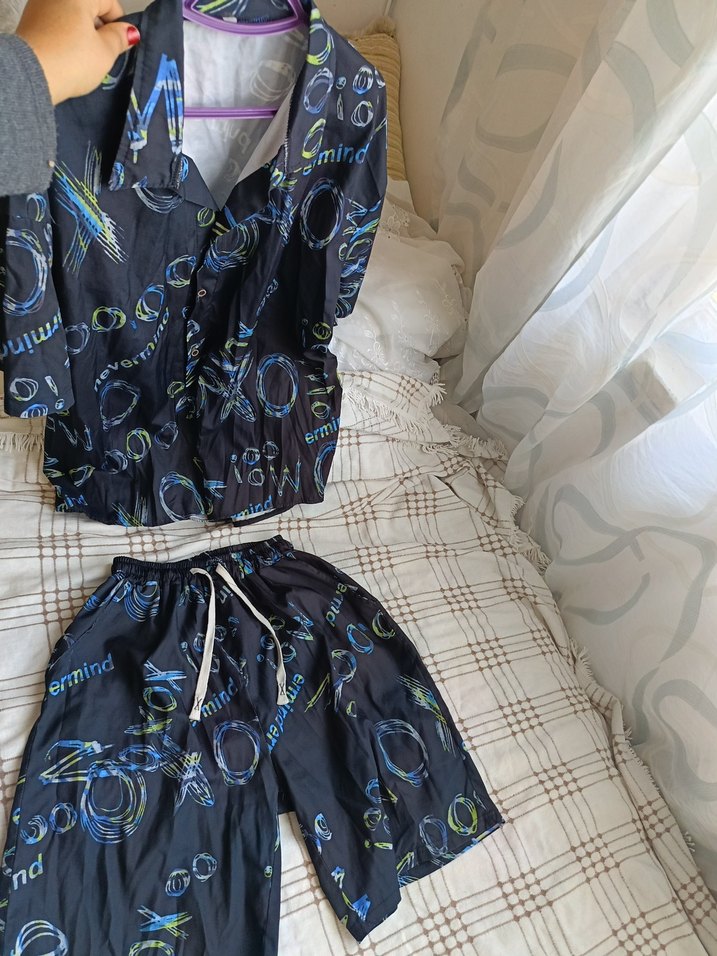 erkekler için rahat kesim, kısa kollu ve mini boyda, mavi batik desenli pijama takımı, günlük rahat kullanım için uygundur.