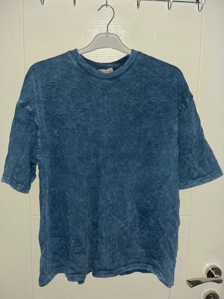 Erkek tişörtü, kısa kollu ve yuvarlak yakalıdır. Yumuşak kumaştan üretilmiş, mavi batik desenlidir, oversize kesimlidir.
