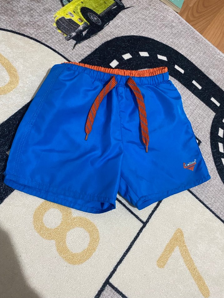 Canlı mavi renkte, belden bağlamalı ve turuncu ip detaylı, bol kesim erkek şort. Rahat sentetik kumaştan üretilmiştir.