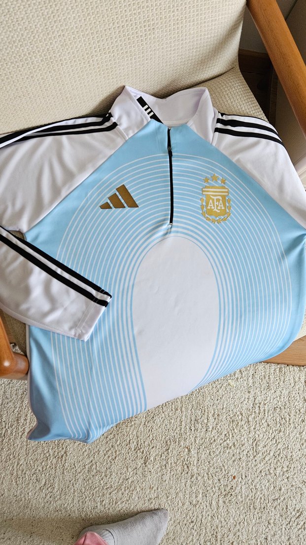 Erkekler için kısa kollu, fermuarlı yuvarlak yakalı, hafif sentetik kumaştan yapılmış, mavi beyaz baskılı futbol formasıdır. Spor ve günlük kullanıma uygundur. ⚽