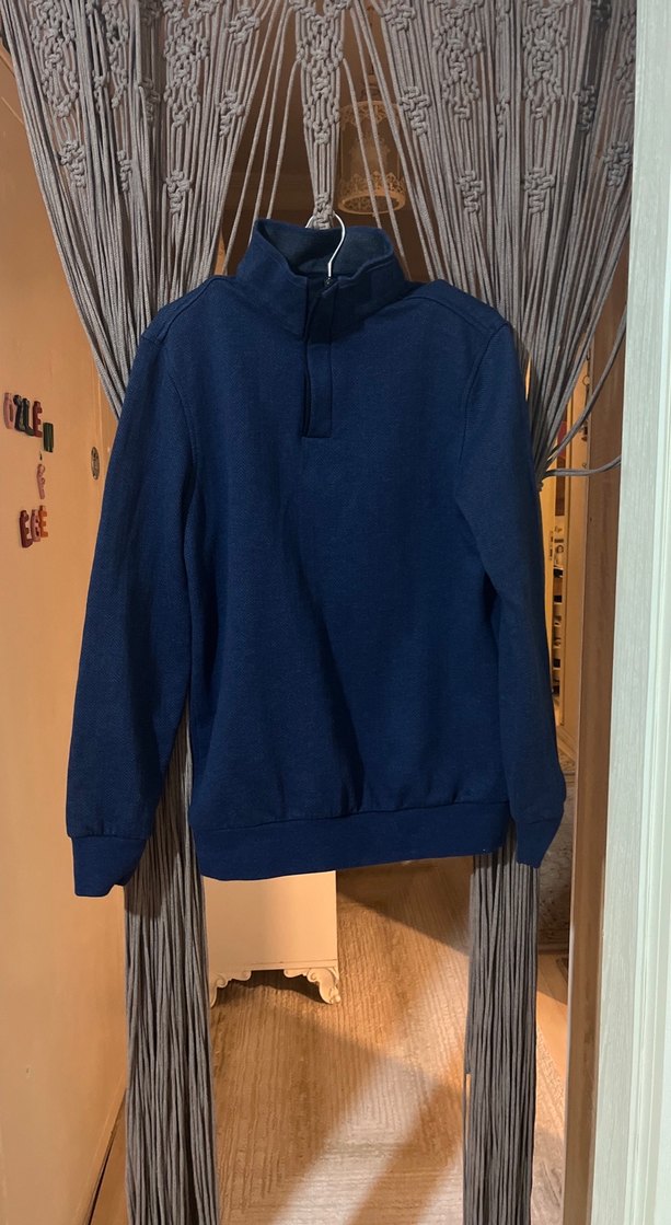 Fermuarlı, uzun kollu, yüksek yakalı ve dar kesim erkek sweatshirtü. Koyu mavi renkli, yumuşak ve sıcak kumaştan üretilmiştir.