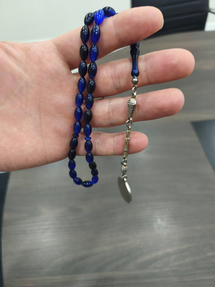 Koyu mavi renkte, bohem minimal tarzda oval taneli ve detaylı gümüş püsküllü erkek tesbihi.